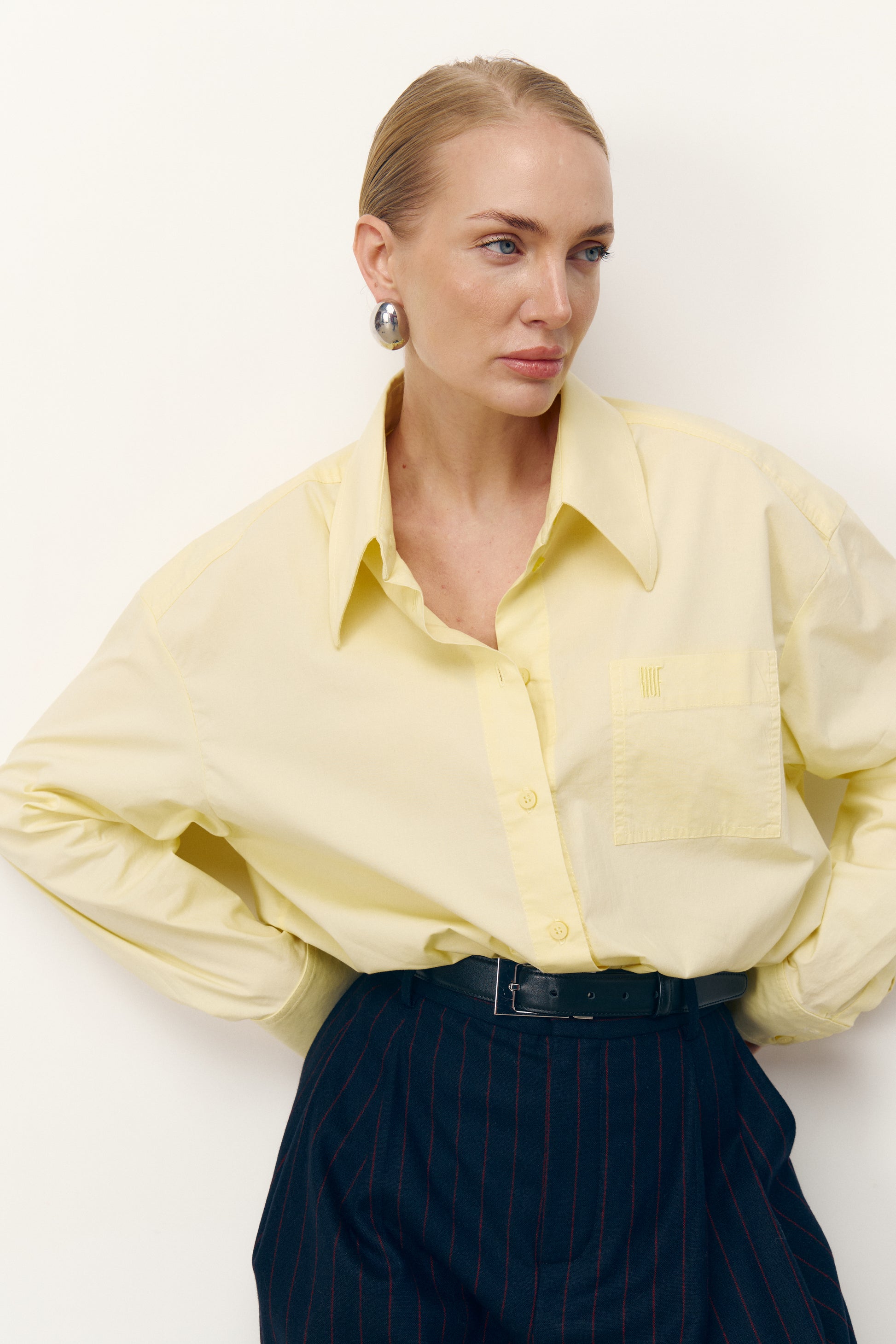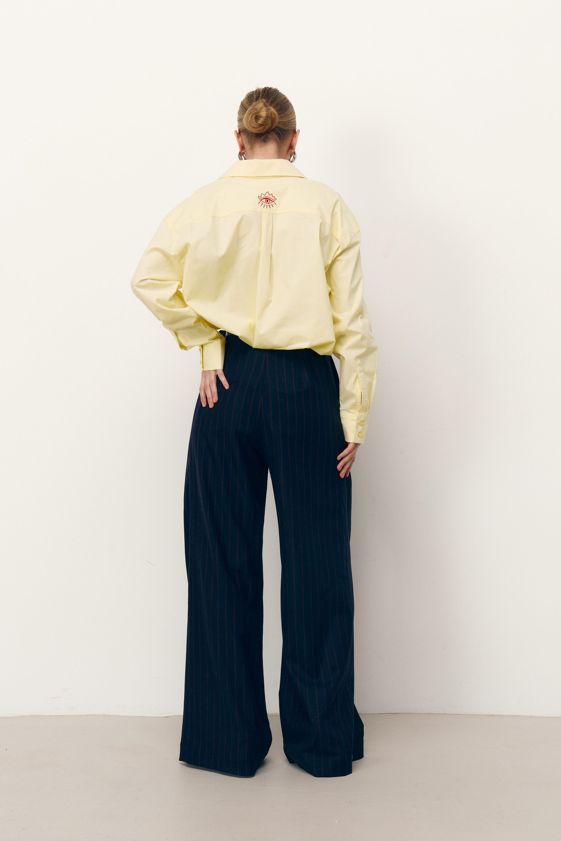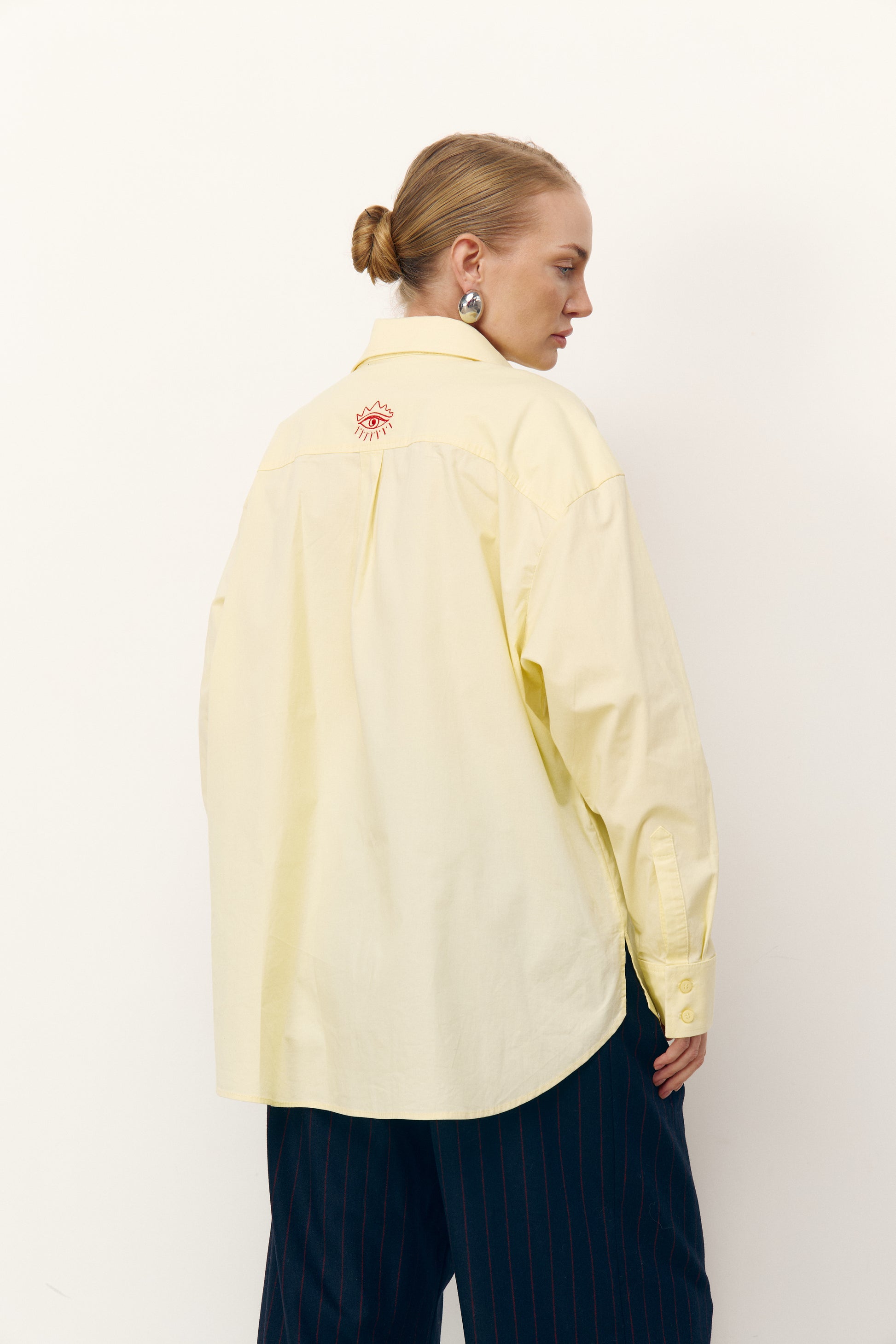 Бавовняна сорочка ідеального вільного крою. На спині червона вишивка у формі ока, символ жіночої інтуїції та внутрішньої сили. Щільний комір і манжети тримають форму, підкреслюючи точність ліній. Акцент — ґудзик на манжеті, пришитий червоною ниткою. Завдяки продуманому силуету модель зручно носити як заправленою, так і навипуск поверх топа чи футболки. Не оверсайз, поєднується з будь-якими низами.